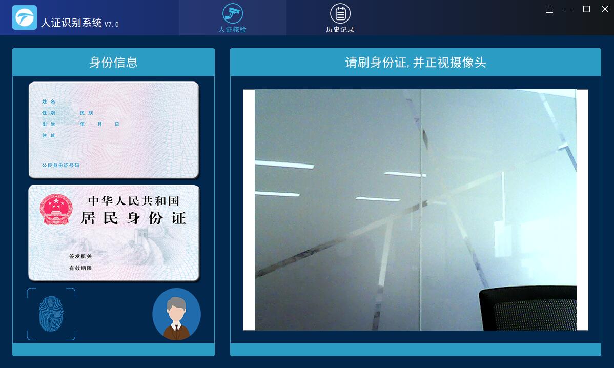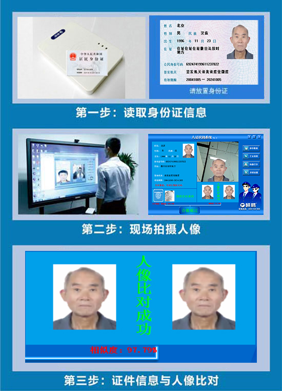 通過(guò)刷身份證來(lái)讀取身份證信息(包括頭像),然后現(xiàn)場(chǎng)拍攝人臉照片。
