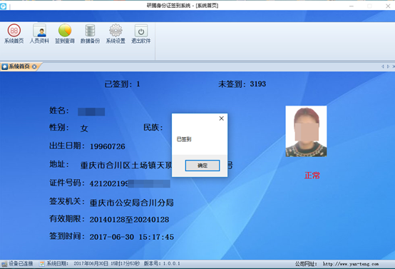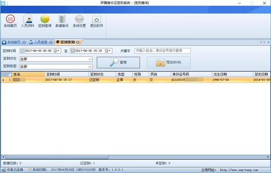 研騰身份證簽到系統(tǒng)是針對需要身份證簽到活動研發(fā)的一款智能簽到系統(tǒng),此系統(tǒng)由身份證閱讀器和簽到管理軟件組成。軟件界面人性化設計,操作簡單,只要提前錄入需要簽到人員身份證信息,通過刷身份證就可隨時完成簽到。并可實時查看簽到人員信息及簽到狀態(tài),導出備份簽到信息。